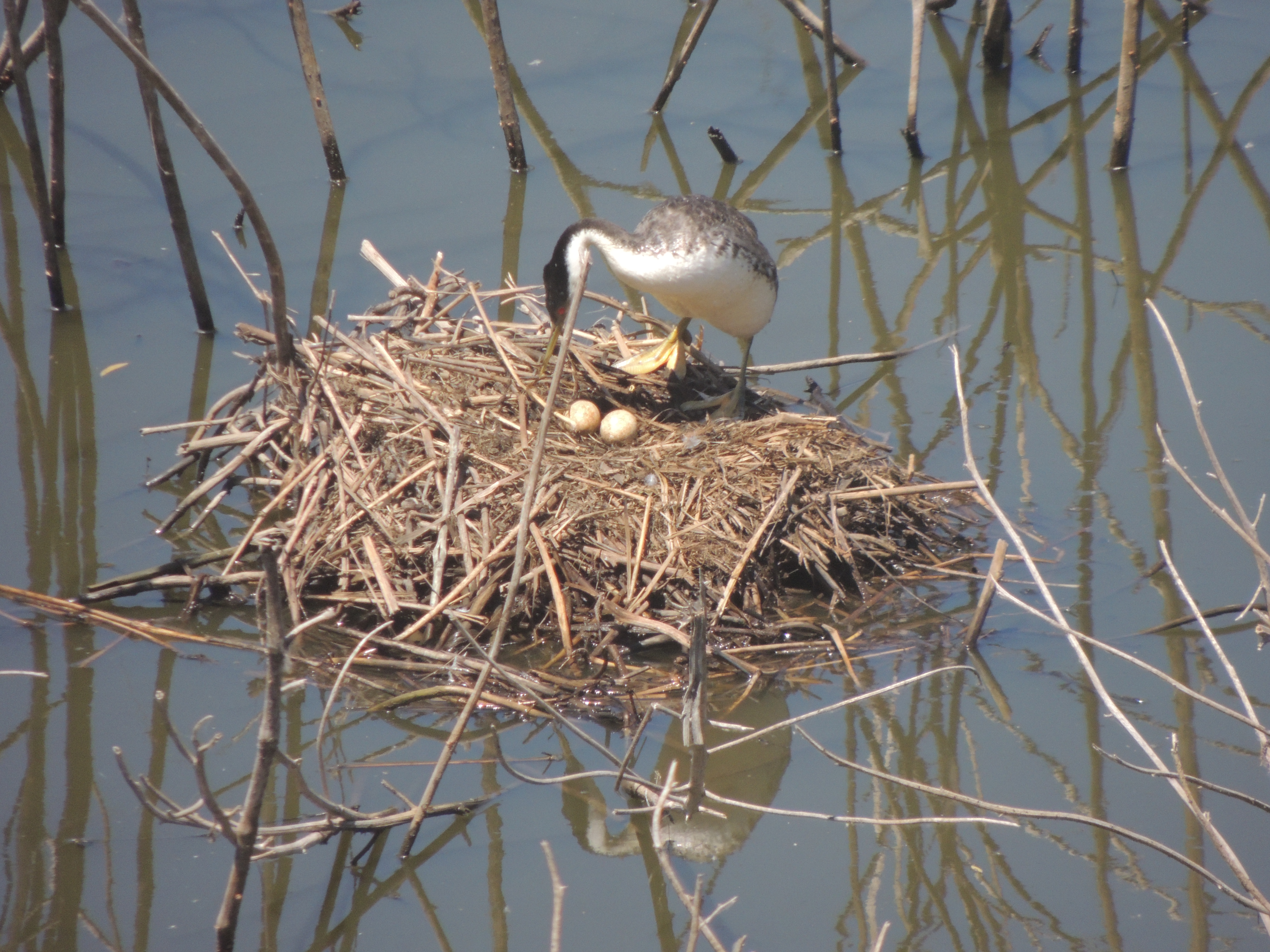 Grebes build large nests at water level on the sticks and branches that are protruding from the water. It is quite a sight to see. In-between the sticks there are lots of nesting birds. My son and I were lucky enough to see one of the birds take a break from the nest and go for a swim, exposing a couple of yellow eggs. Of course the mommy did not go far from the nest and kept swimming close to check on the eggs.